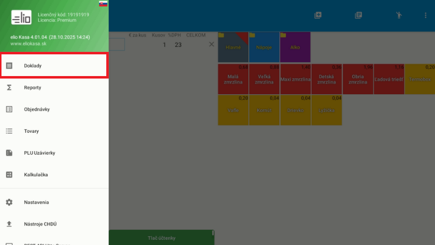 V hlavnom menu si nájdeme možnosť Doklady, z ľavej ponuky možností kde sú v ľavom hornom rohu 3 čiary.