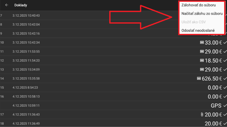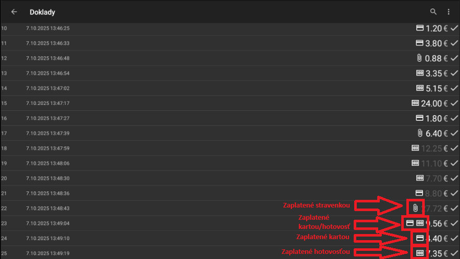 Vystavené doklady majú pri cene napravo ikonku, ktorá označuje akým spôsobom bola účtenka zaplatená.