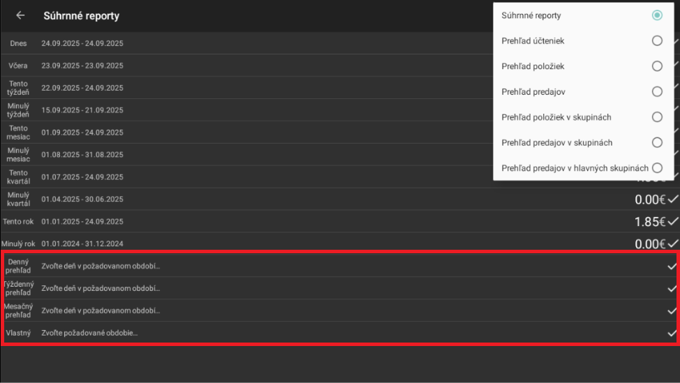 2. Vyberte obdobie, za ktoré chcete uzávierku zobraziť (napr. dnes, včera, od–do), alebo podľa čísla uzávierky.