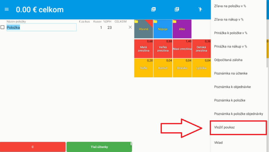 Po vložení poukazu, zobrazí sa na ploche a vytlačí na účtenke.