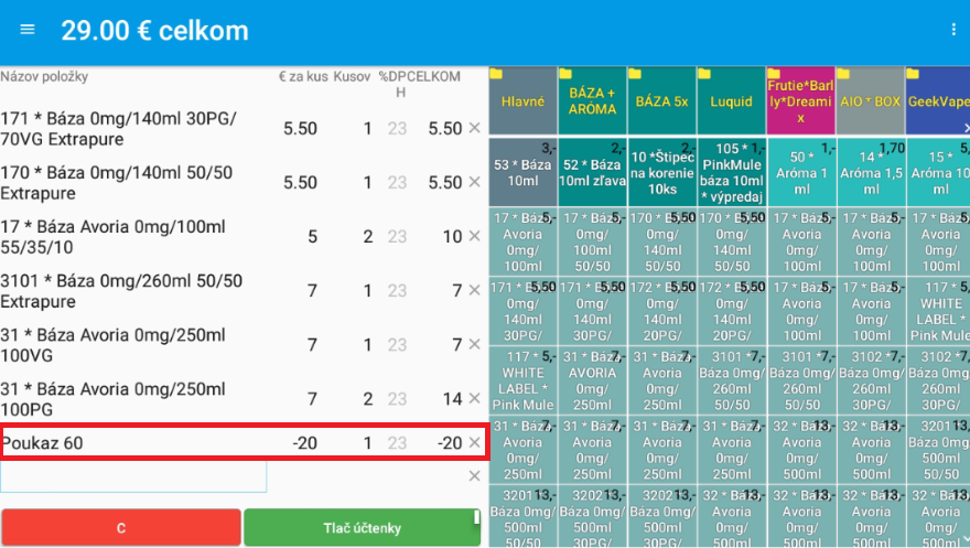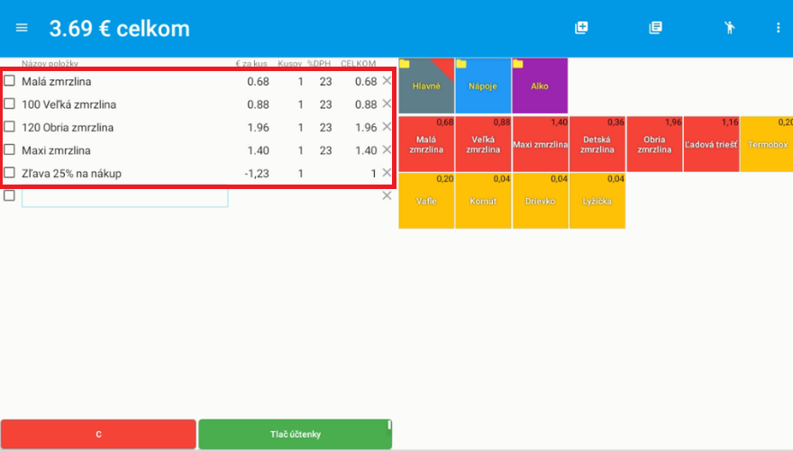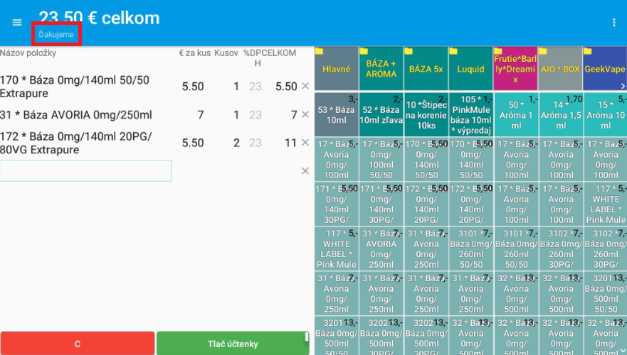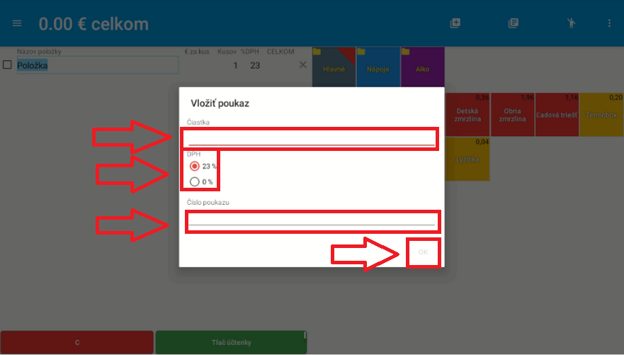 V prvom kroku zadáme číselnú čiastku. Po zadaní čiastky klikneme na preddefinované tovary v hornej lište. Tovar a jeho suma sa pridá na pokladničný doklad.