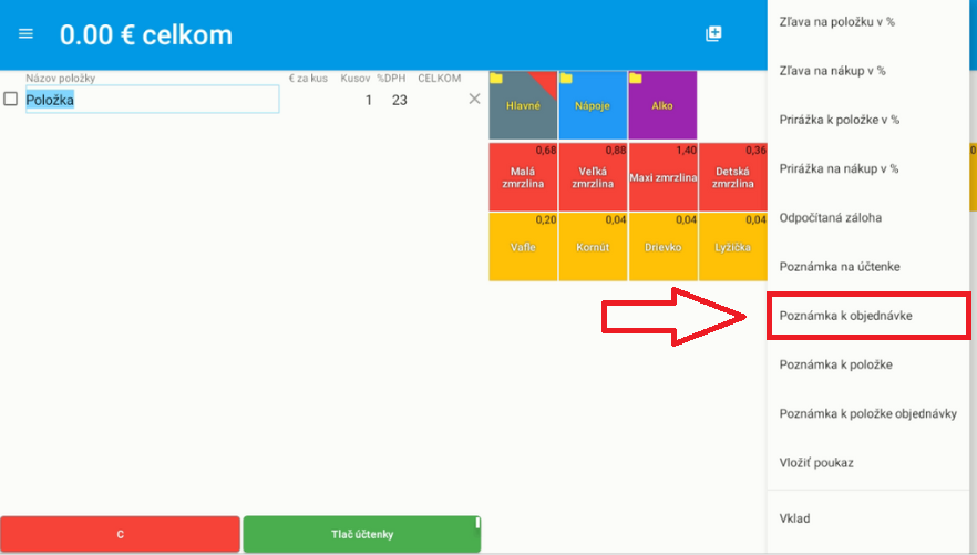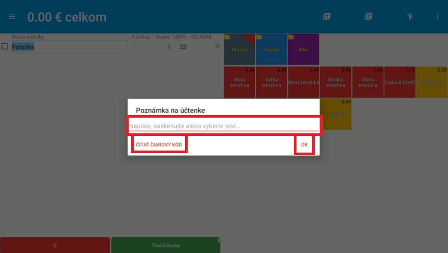 5. Zadaná poznámka sa zobrazí pod celkovou sumou v ľavom hornom rohu a na vytlačenej účtenke pod zoznamom položiek.