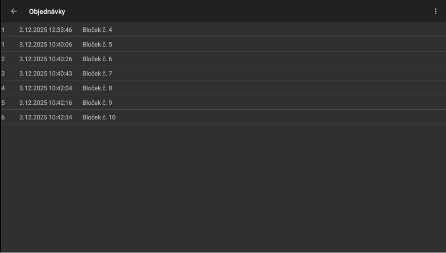 Pre zobrazenie vytvorených objednávok, v hlavnom menu aplikácie stlačte ikonu 3 čiarok v ľavom hornom rohu a vyberte možnosť Objednávky.