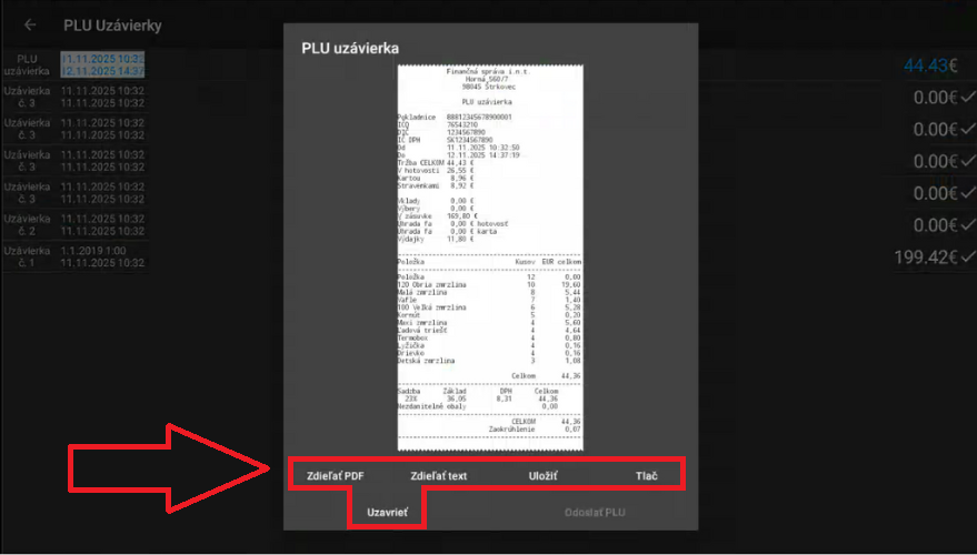 3. Po stlačení na vybranej PLU uzávierky, vám systém zobrazí zoznam všetkých predaných položiek s:
