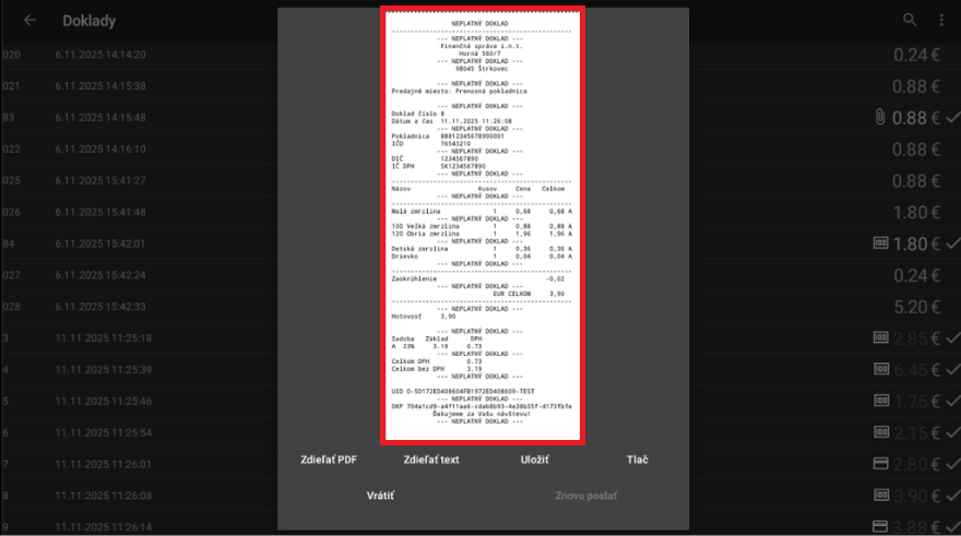 Ďalšou možnosťou sú Neplatné doklady. Voľbu vyberieme v hornej lište, v pravom hornom rohu 3 bodky a následne potiahneme nižšie v ponuke funkcií, a po zapnutí tejto možnosti sa všetky doklady budú tlačiť ako neplatné (skušobné).Keď aktivujete funkciu, celá horná lišta sa sfarbí červenou farbou, čo značí neplatné doklady/skušobný režim.