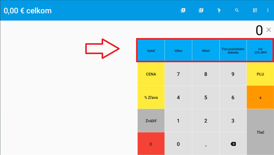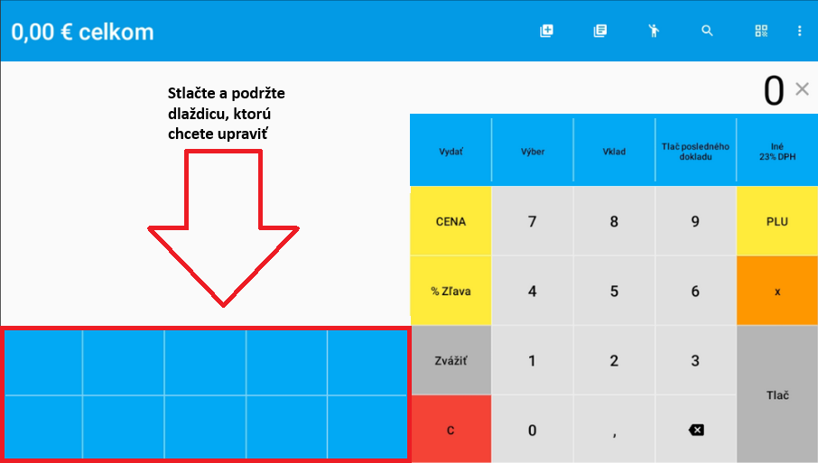 Tieto tlačidlá (prázdne modré dlaždice), sú jednotlivo prispôsobiteľné ich podržaním a následným vpísaním popisu, a vybraním sadzby DPH.