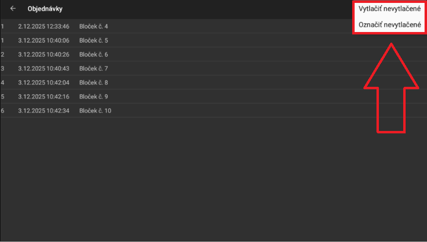 - Označiť nevytlačené (Označí nevytlačené objednávky v zozname).