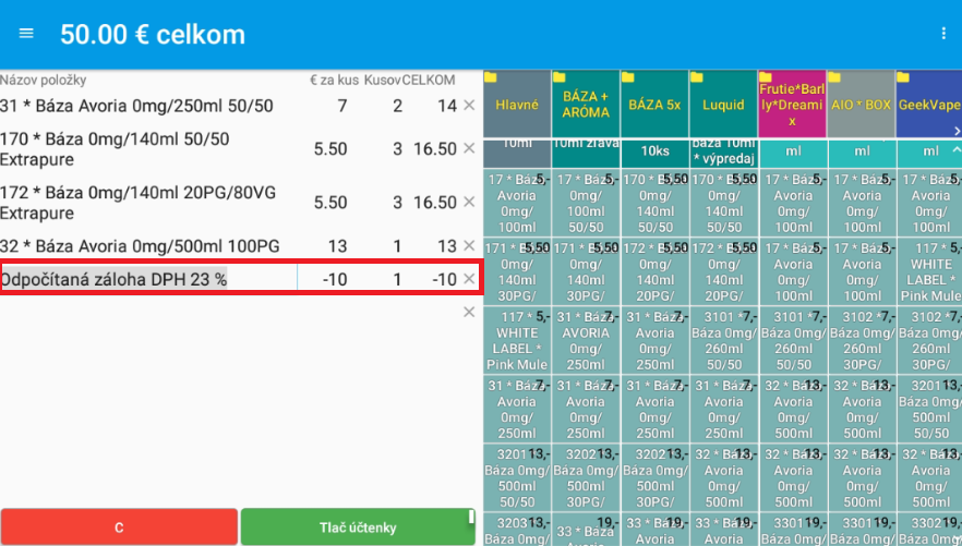 Pokiaľ zákazník zaplatil určitú čiastku vopred, aplikácia ponúka funkciu Odpočítaná záloha, čo znamená, že od jedného produktu sa odráta už zaplatená záloha (čiže čiastka, ktorú zákazník zaplatil vopred).