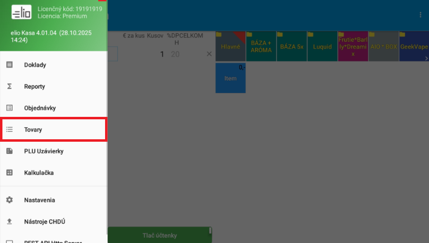 V ľavom hornom rohu aplikácie stlačte ikonu 3 čiar a tlačte možnosť Tovary.