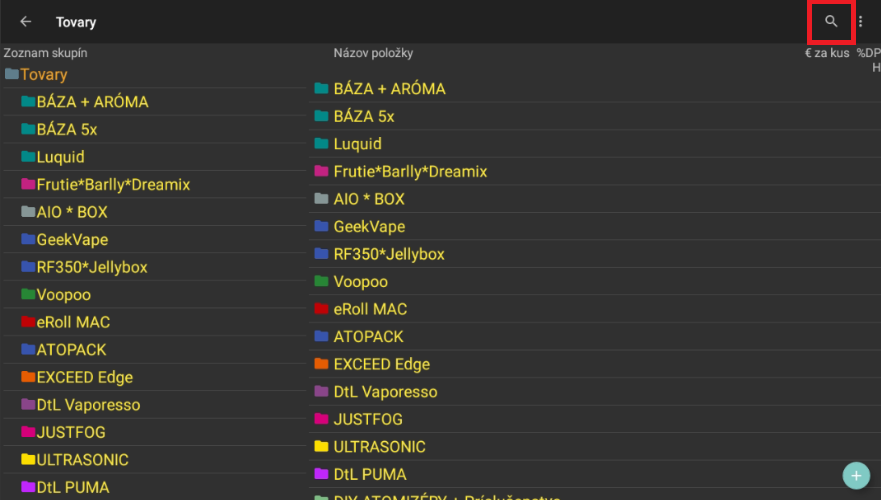 Pokiaľ hľadáte určitú položku je možné ju vyhľadať stlačením ikony lupy hneď vedľa 3 bodiek napravo hore a napísaním názvu danej položky vo vyhľadávacej kolonke.