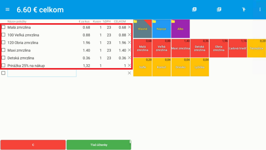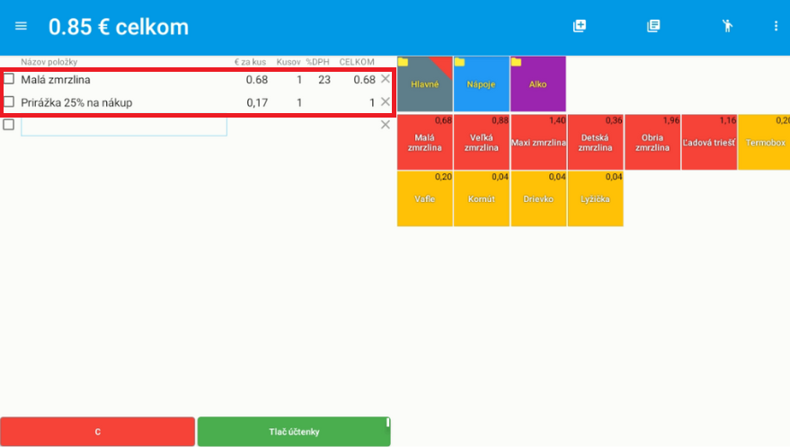 Po pridaní všetkých položiek na pokladničný doklad, doklad ukončíme pomocou tlačidla Tlač.
