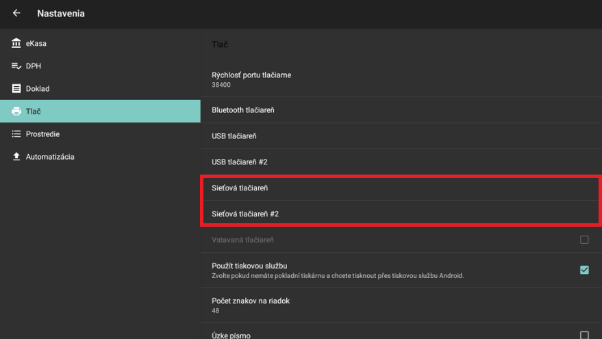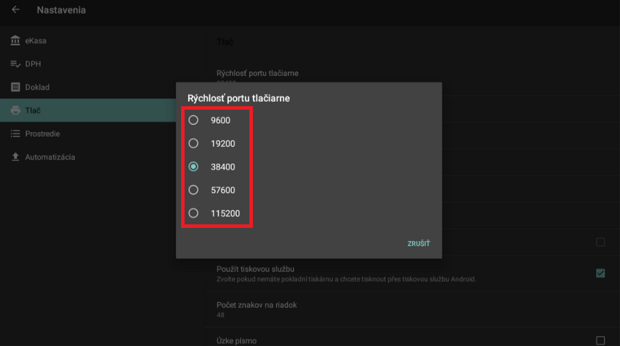 V aplikácii je potrebné nastaviť – Rýchlosť portu tlačiarne na 38400,
