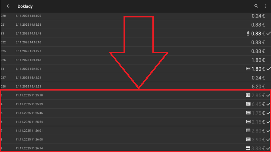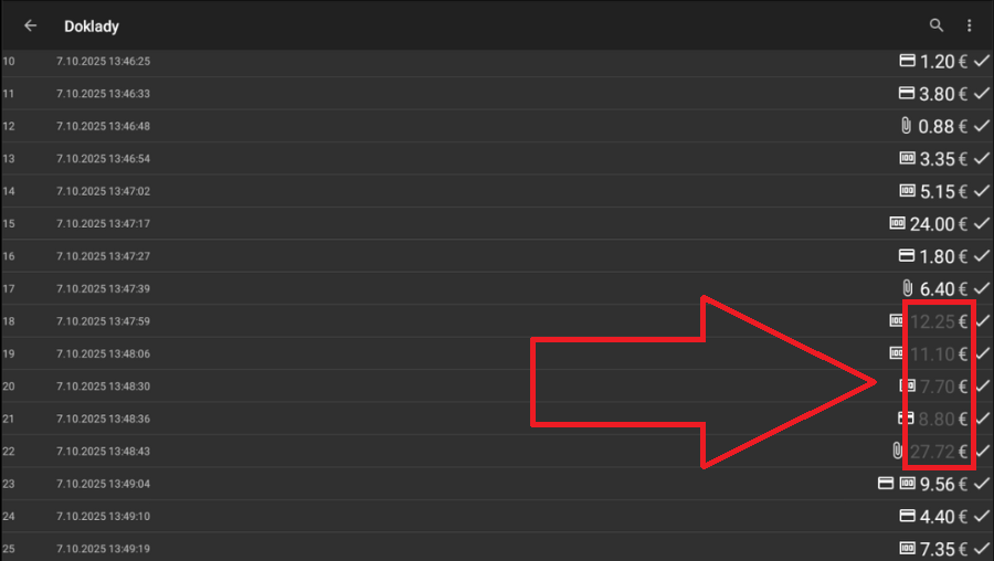 Vystavené doklady majú pri cene napravo ikonku, ktorá označuje akým spôsobom bola účtenka zaplatená.