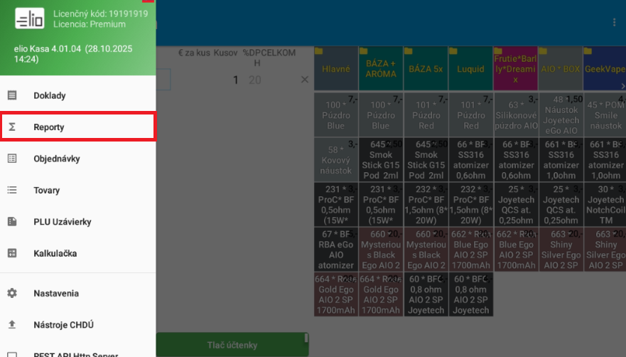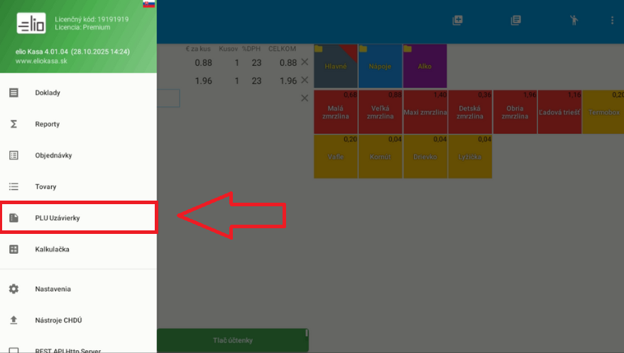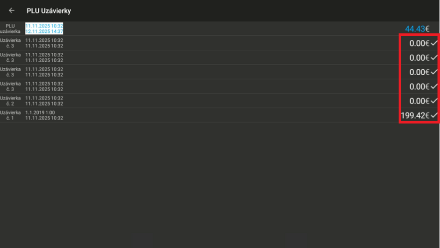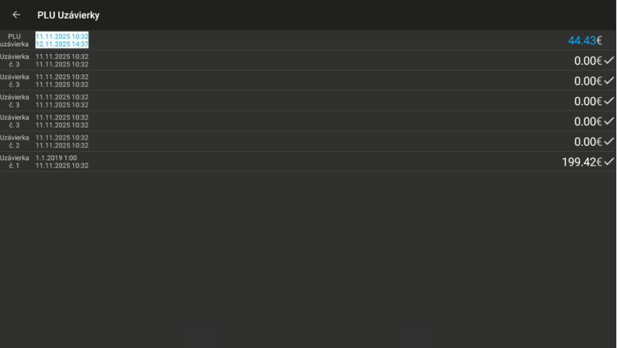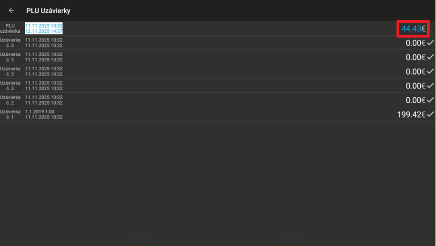 Otvorte hlavné menu ☰ → PLU Uzávierky.