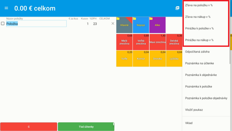 V pravom hornom rohu stlačte 3 bodky, ukáže sa vám ponuka funkcií a hneď od samého vrchu vidíte možnosti Zľavy a Prirážky ako na obrázku nižšie.