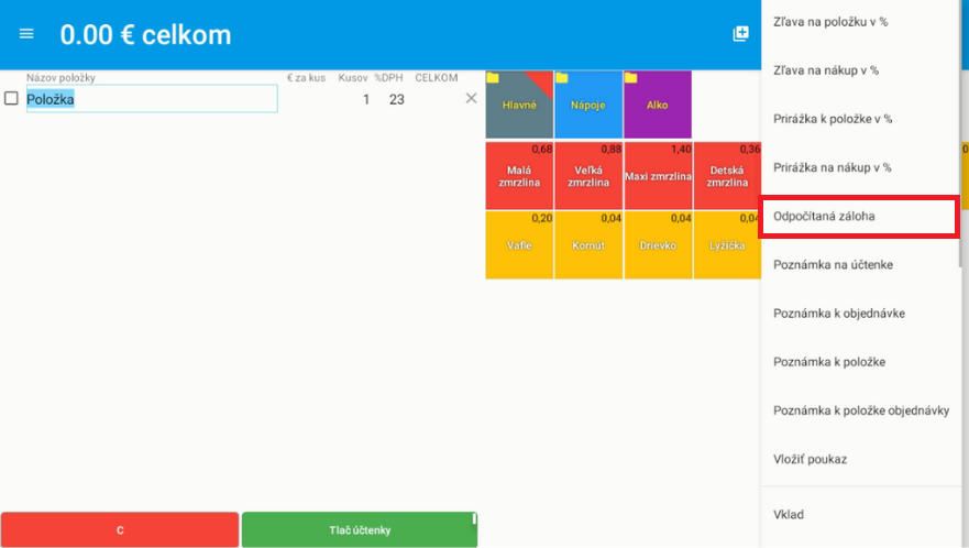 Pokiaľ zákazník zaplatil určitú čiastku vopred, aplikácia ponúka funkciu Odpočítaná záloha, čo znamená, že od jedného produktu sa odráta už zaplatená záloha (čiže čiastka, ktorú zákazník zaplatil vopred).