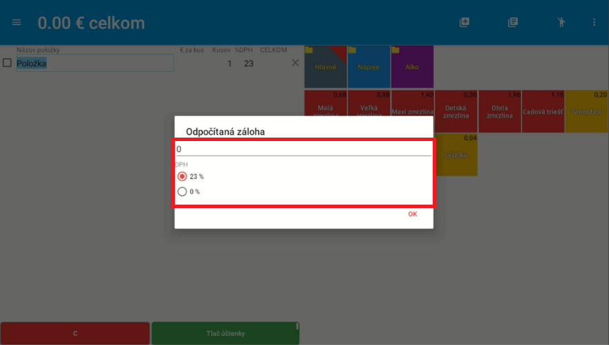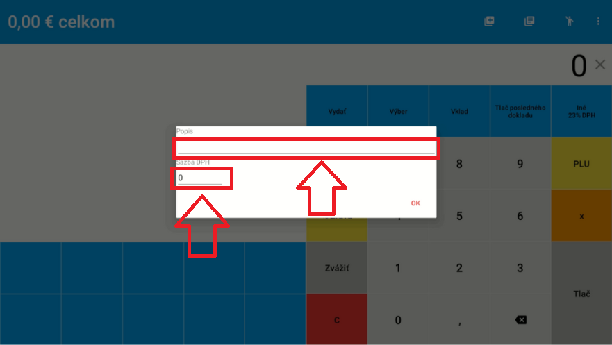 Tieto tlačidlá (prázdne modré dlaždice), sú jednotlivo prispôsobiteľné ich podržaním a následným vpísaním popisu, a vybraním sadzby DPH.