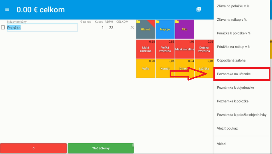 5. Zadaná poznámka sa zobrazí pod celkovou sumou v ľavom hornom rohu a na vytlačenej účtenke pod zoznamom položiek.