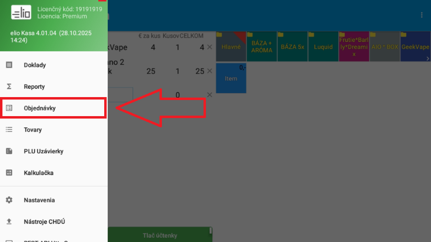 Pre zobrazenie vytvorených objednávok, v hlavnom menu aplikácie stlačte ikonu 3 čiarok v ľavom hornom rohu a vyberte možnosť Objednávky.