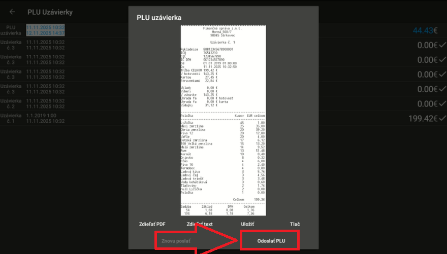 3. Po stlačení na vybranej PLU uzávierky, vám systém zobrazí zoznam všetkých predaných položiek s: