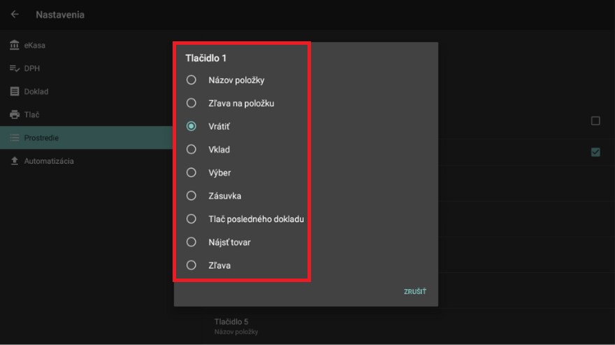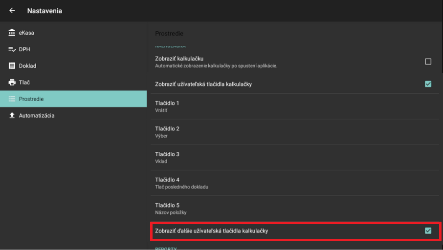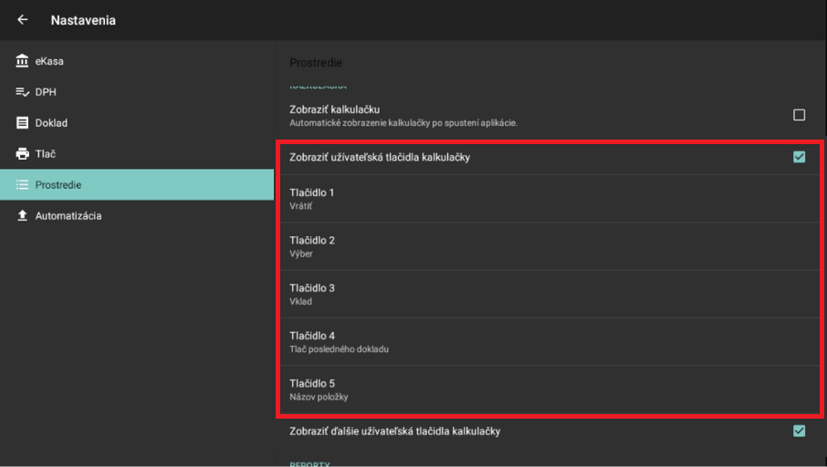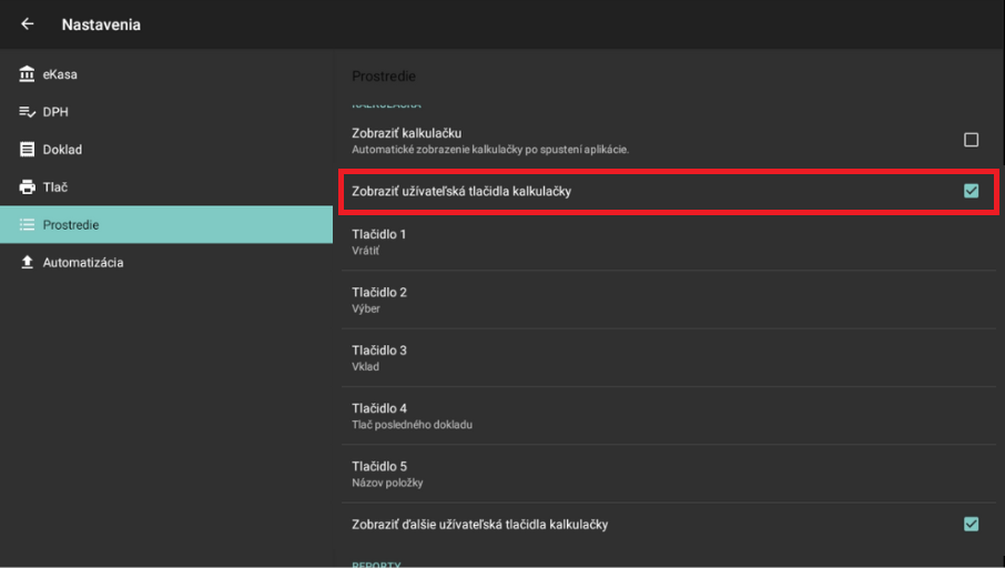 V nastaveniach Prostredie je možné nastaviť zobrazenie užívateľských tlačidiel v rozhraní Kalkulačka.