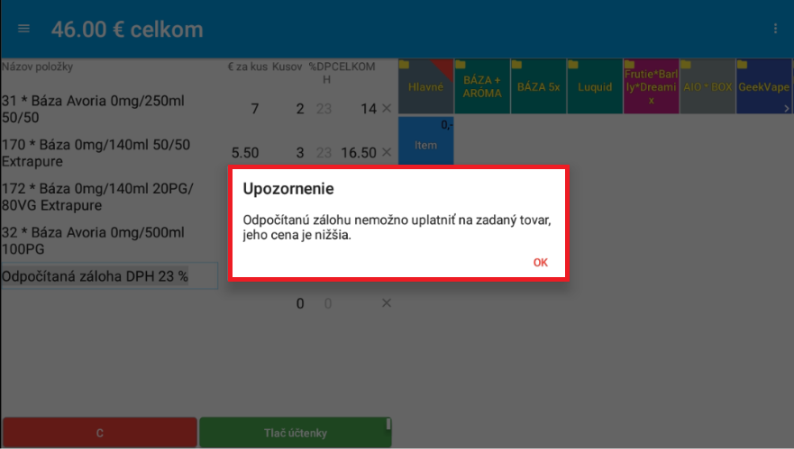 Suma odpočítanej zálohy je ľubovoľne nastaviteľná v kolonke, no nesmie byť vyššia ako je cena produktu, na ktorý sa vzťahuje.
