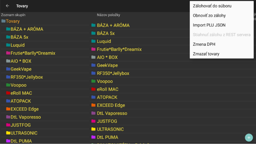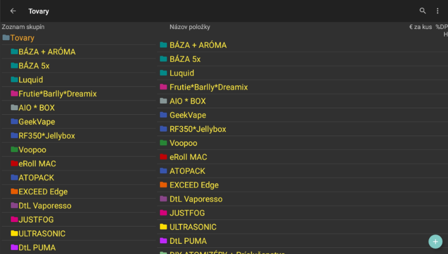 Preddefinované tovarové skupiny v hornom zozname je možné pravovať. Tovarovú skupinu upravíme dlhým kliknutím na ňu. Následne sa otvorí formulár na úpravu tovarovej skupiny. Je možné upraviť názov tovarovej skupiny a sadzbu DPH v %.