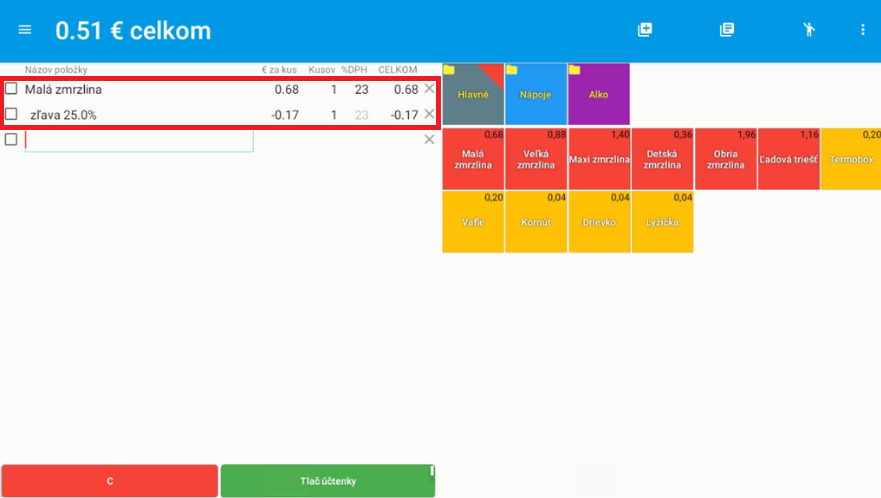 Tovar je možné z pokladničného dokladu odstrániť pomocou tlačidla krížik pri sume.