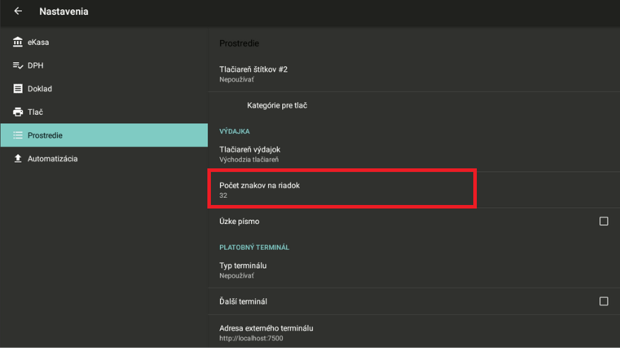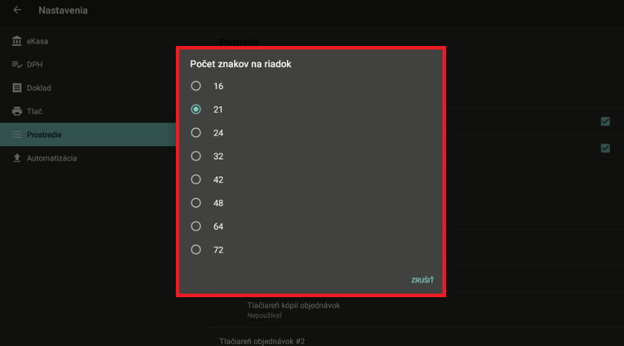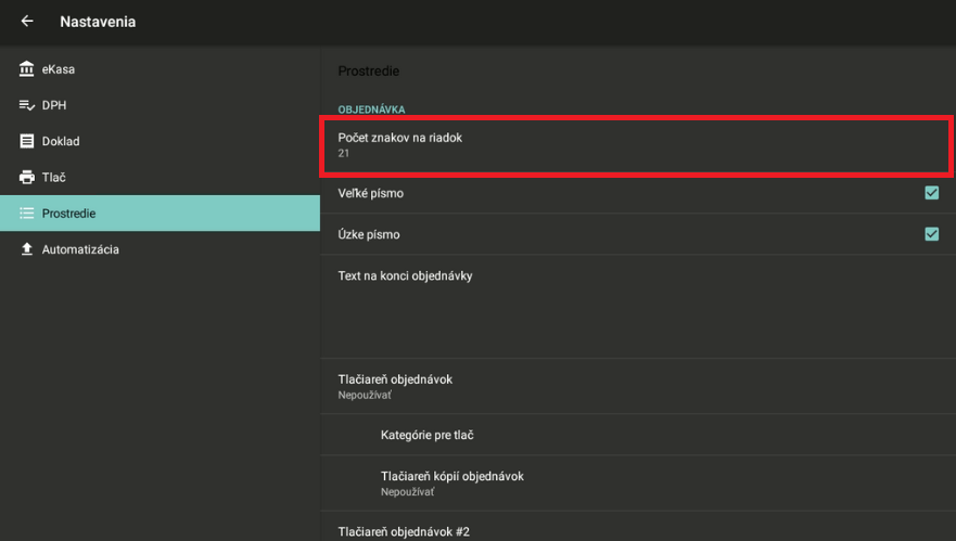 Počet znakov na riadok, sa nastavuje podľa typu tlačiarne, počet znakov na riadok.