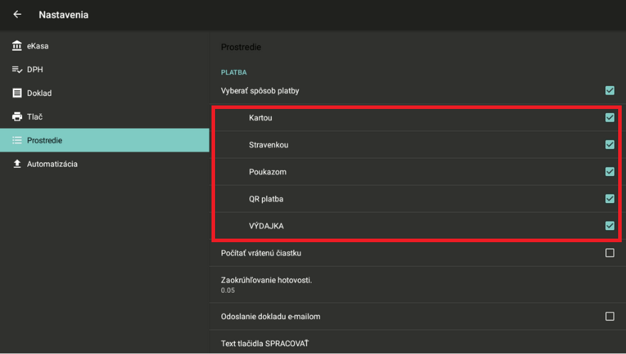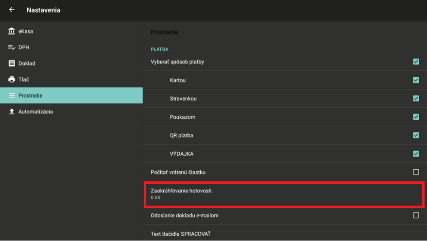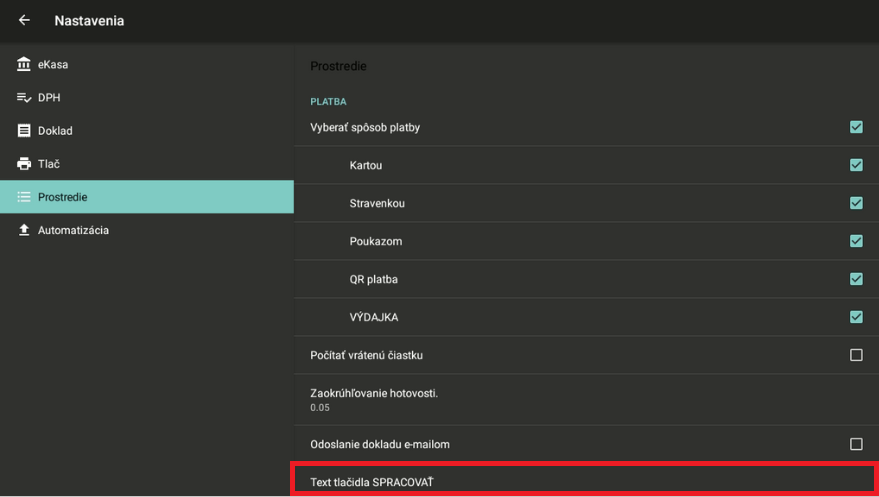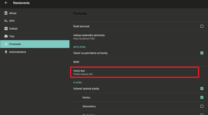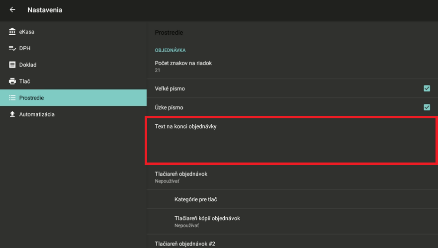 Text na konci dokladu a zadáme text, ktorý chceme, aby sa tlačil na konci pokladničného dokladu.