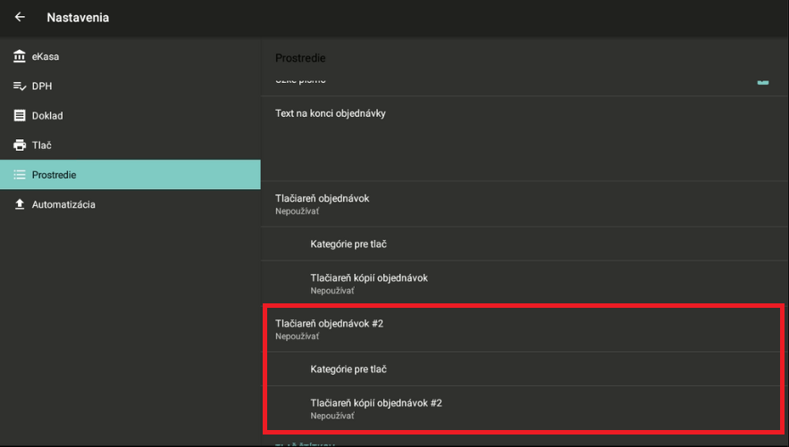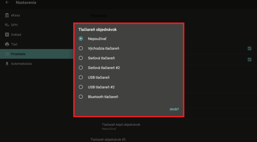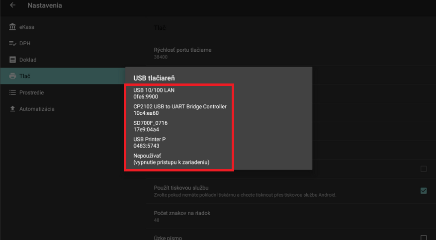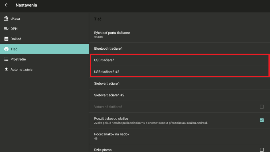 (2) USB Tlačiareň: Ponúka možnosť aktívne používaných až 2 USB tlačiarní. (napr. #1 pre doklady a #2 pre objednávky)