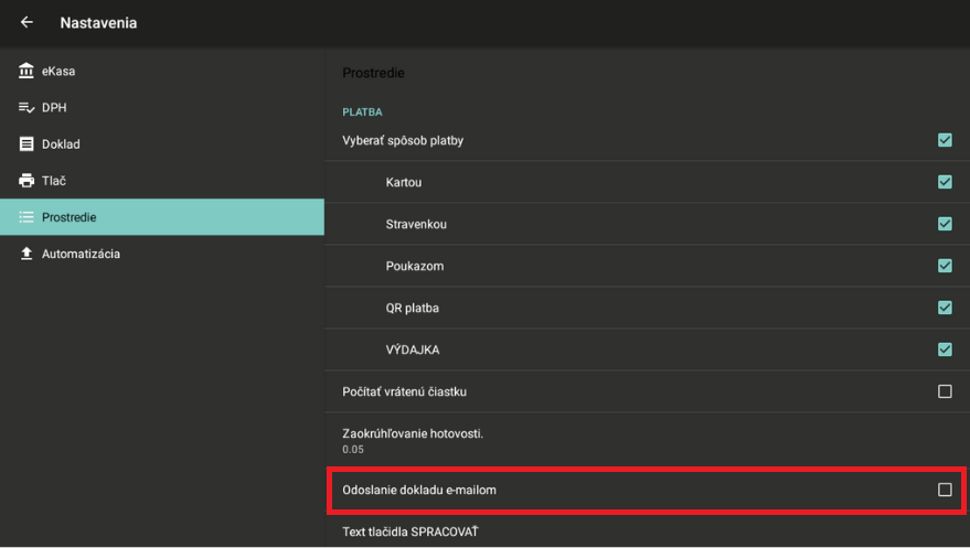 vyberieme a znovu ako v predchádzajúcom prípade, zaškrtneme možnosť Doklady ukladať na Gmail