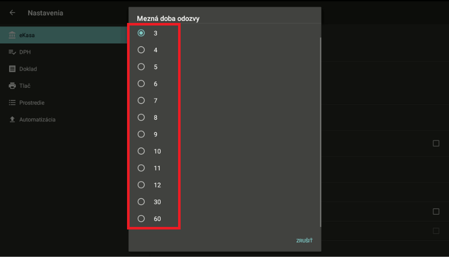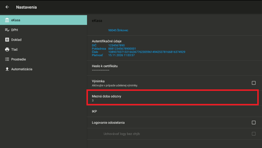 doba odozvy, a nachádza sa v Nastavenia-eKasa.
