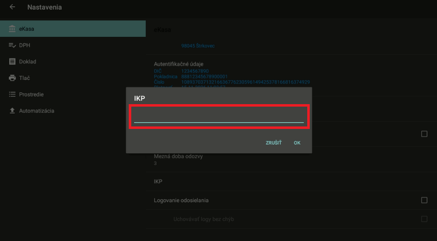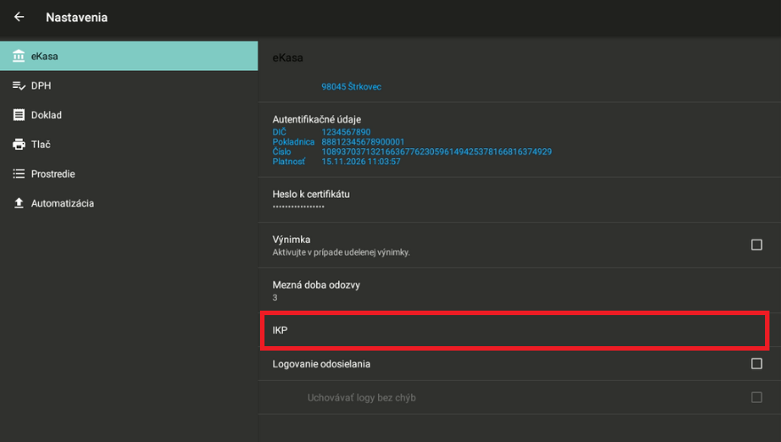 IKP - Interný kód pokladne , používa sa len pre testovacie účely pre odosielanie správ do BackOffice v testovacom prostredí eKasa .