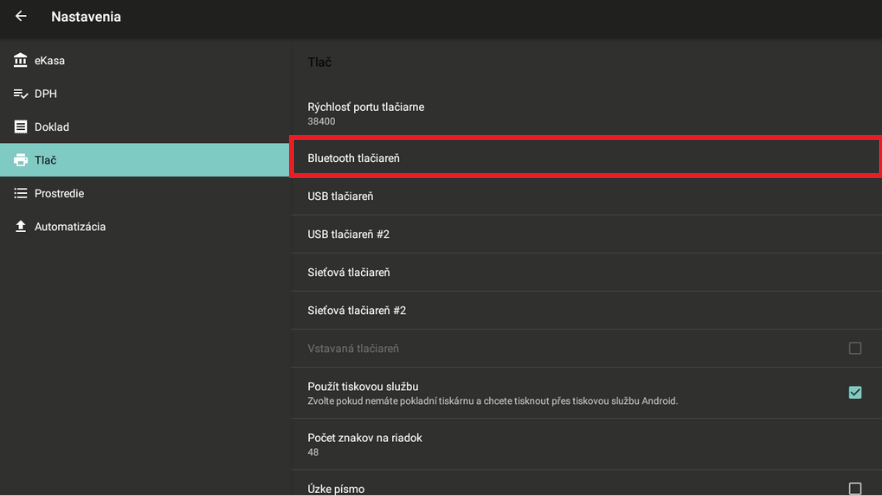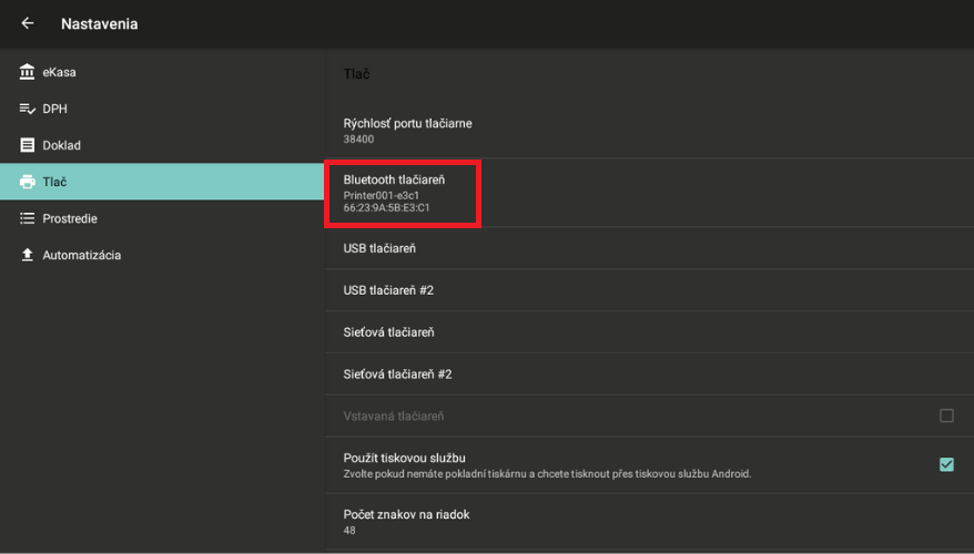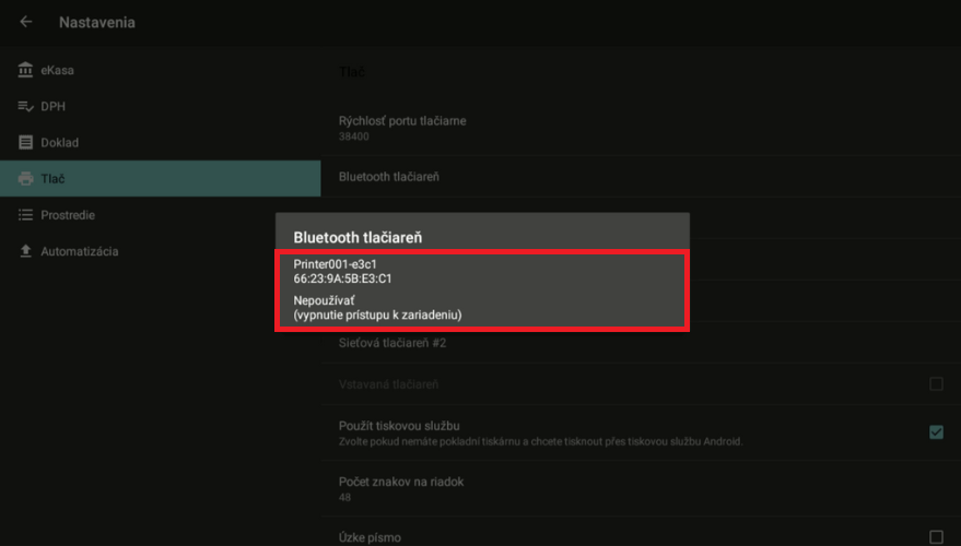 Pripojíme bluetooth tlačiareň s zariadením obsahujúcim ELIO KASA, a vyberieme ako aktívnu v nastavení Bluetooth tlačiareň.