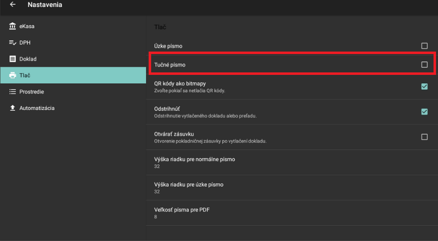 Tučné písmo, robí opak čo znamená že písmo na vytlačenom doklade bude hrubšie a výraznejšie.